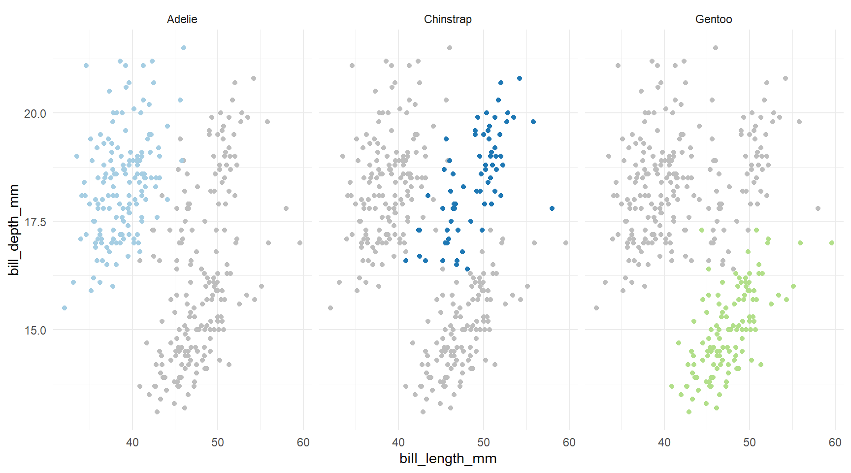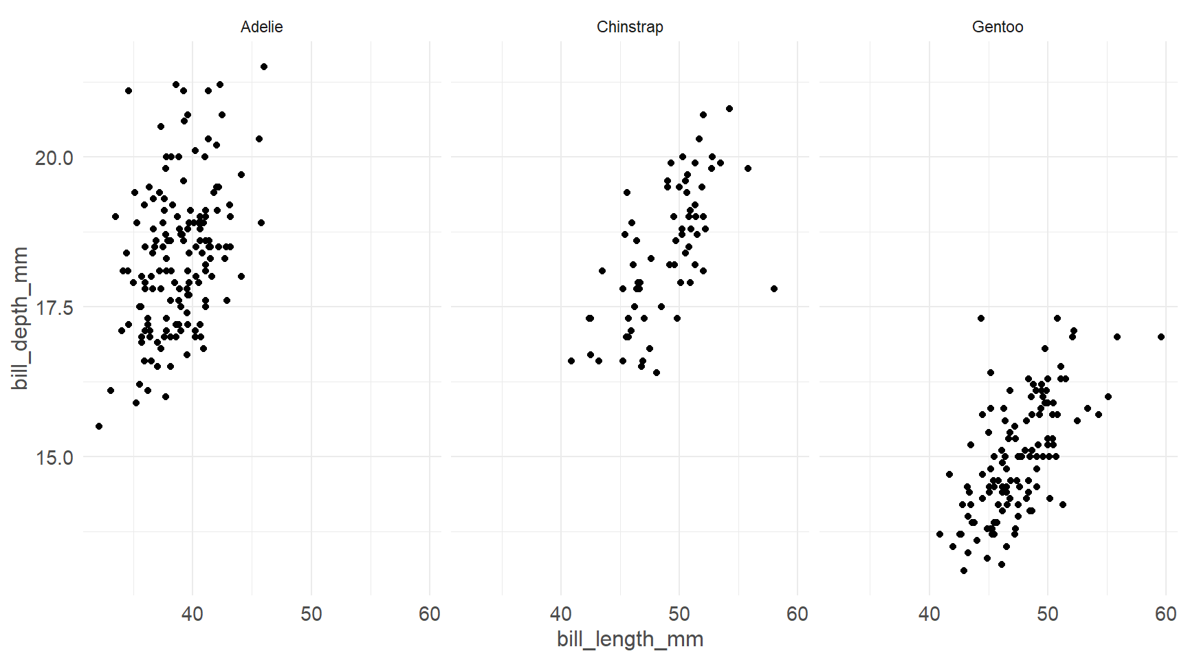 ggplot(pen, aes(x=bill_length_mm, y=bill_depth_mm)) + geom_point() + facet_wrap(~species)
