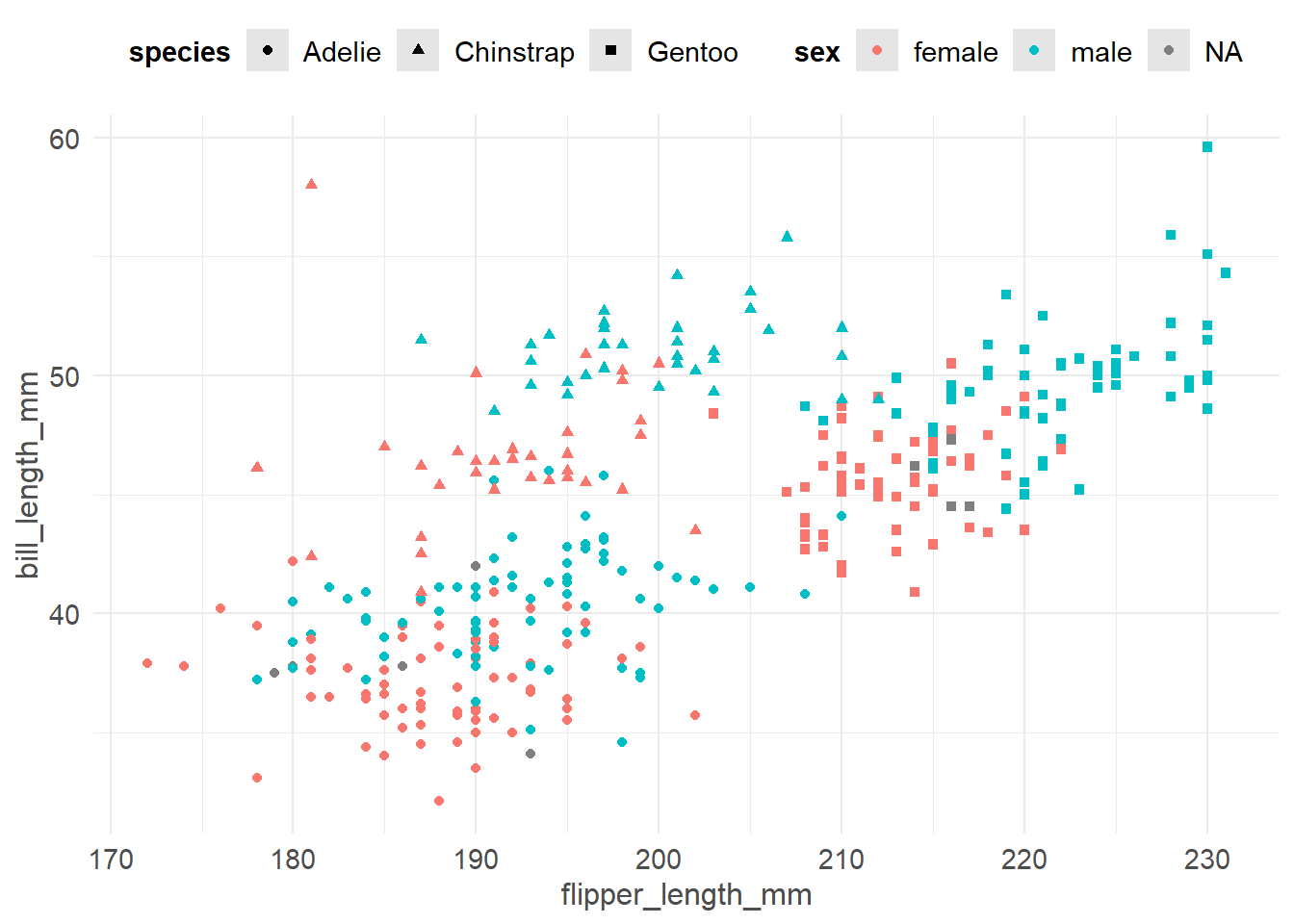 ggplot(pen, aes(x=flipper_length_mm, y=bill_length_mm, color=sex, shape=species)) + geom_point()