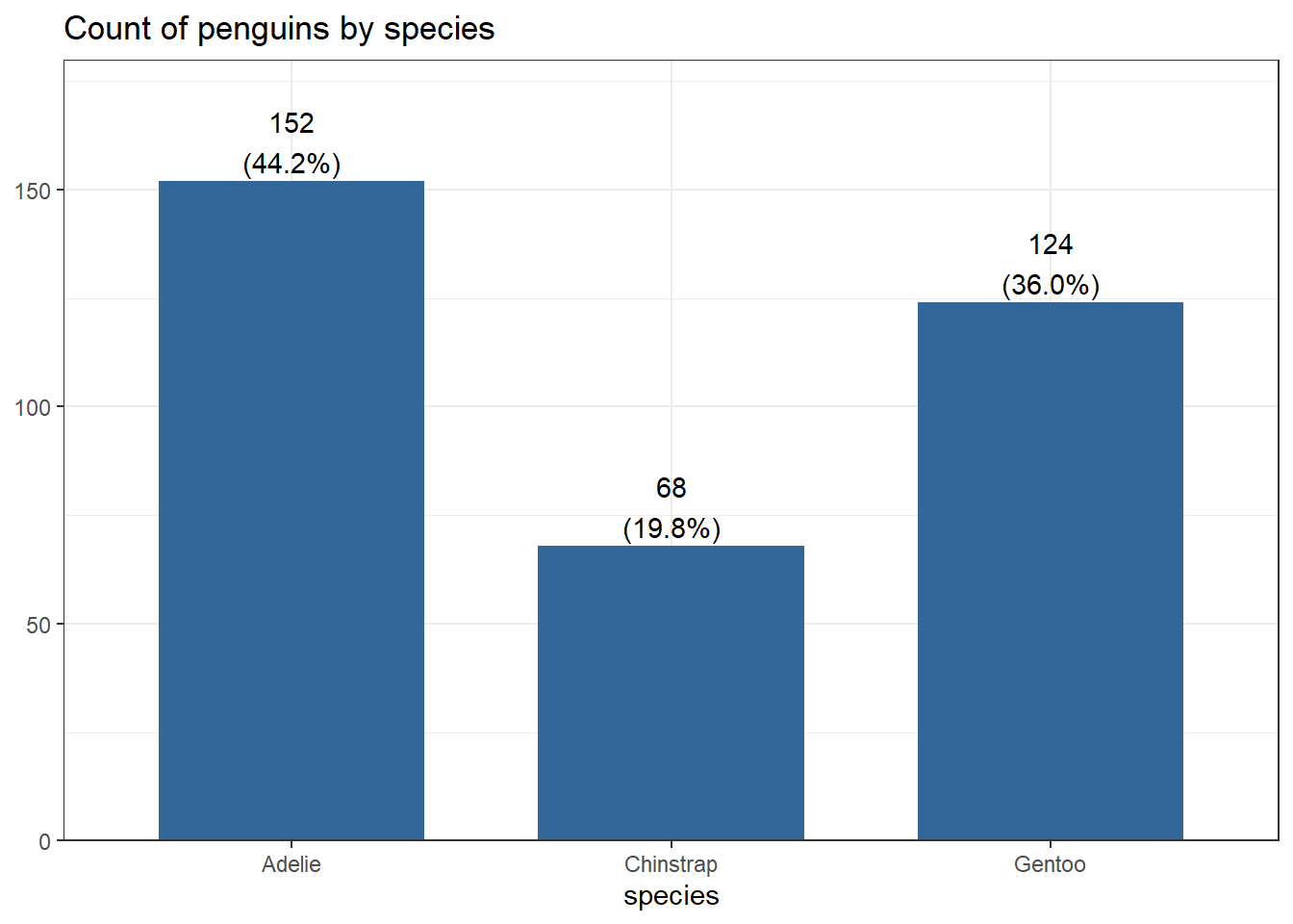 title = "Count of penguins by species")