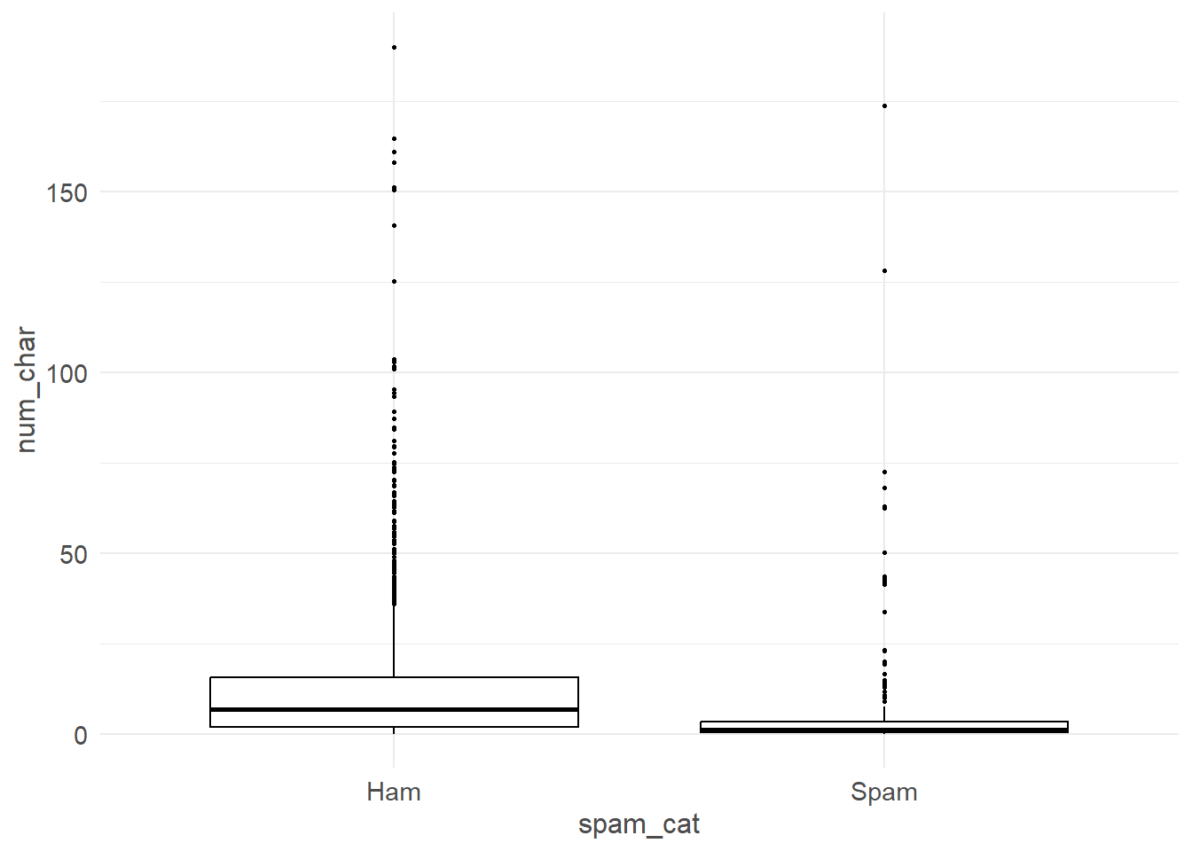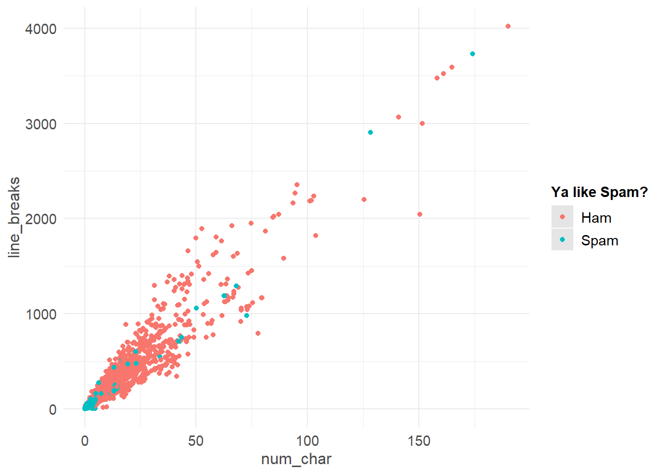 Consider a continuous variable for the number of characters in an email num_char, and a 0/1 binary variable spam.