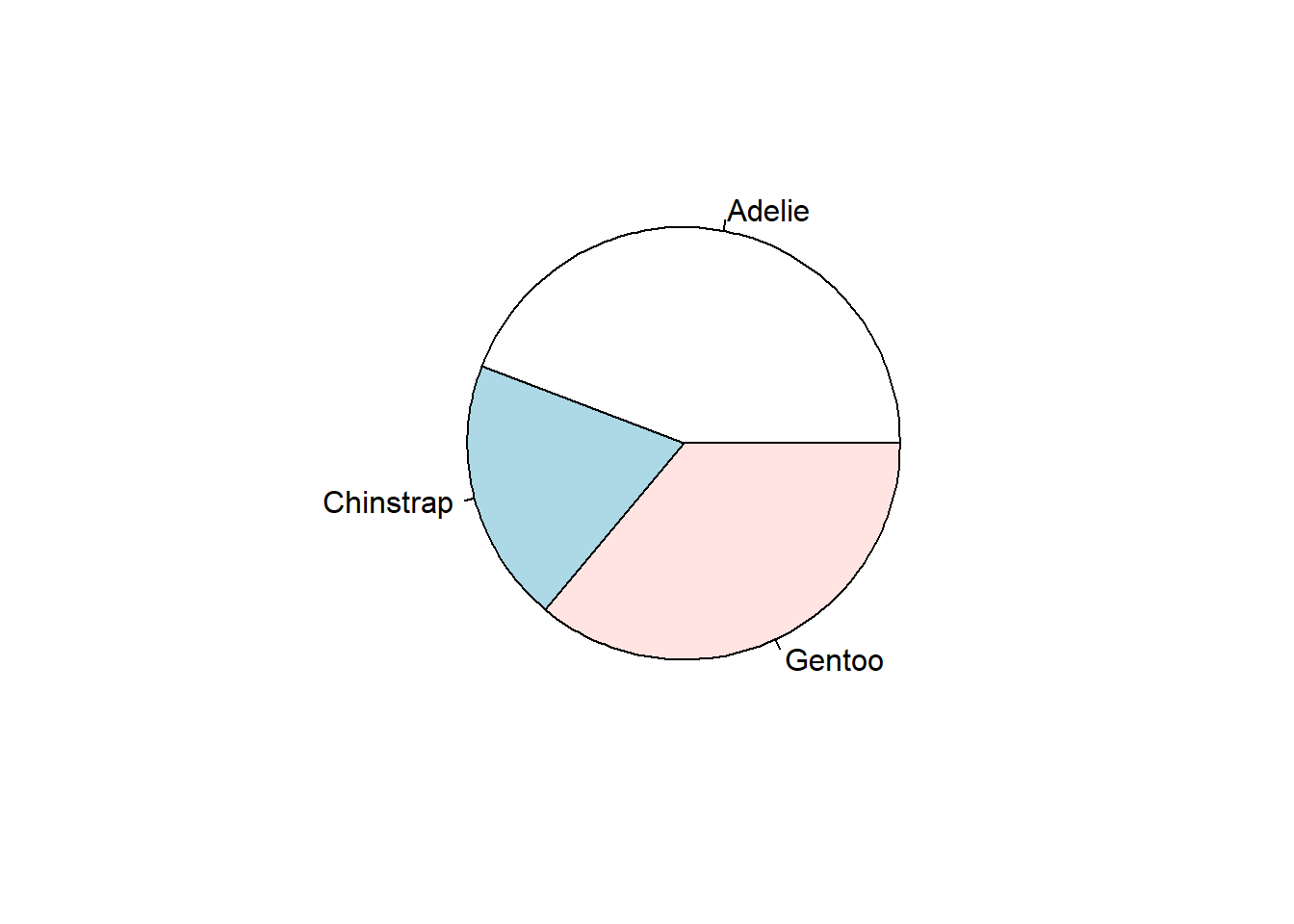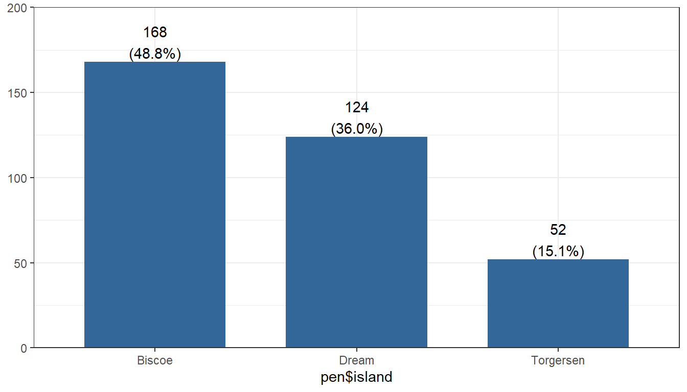 pen <- palmerpenguins::penguinsBoth Nominal and Ordinal data types can be visualized using the same methods: tables, barcharts and pie charts.