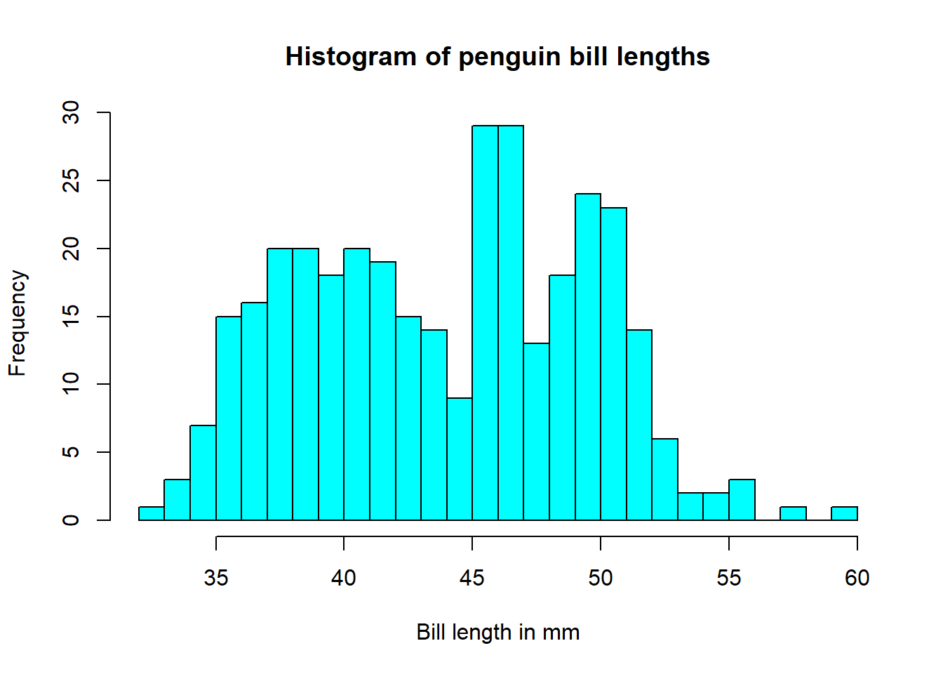hist(pen$bill_length_mm, xlab="Bill length in mm", main="Histogram of penguin bill lengths", col="cyan", breaks=20)