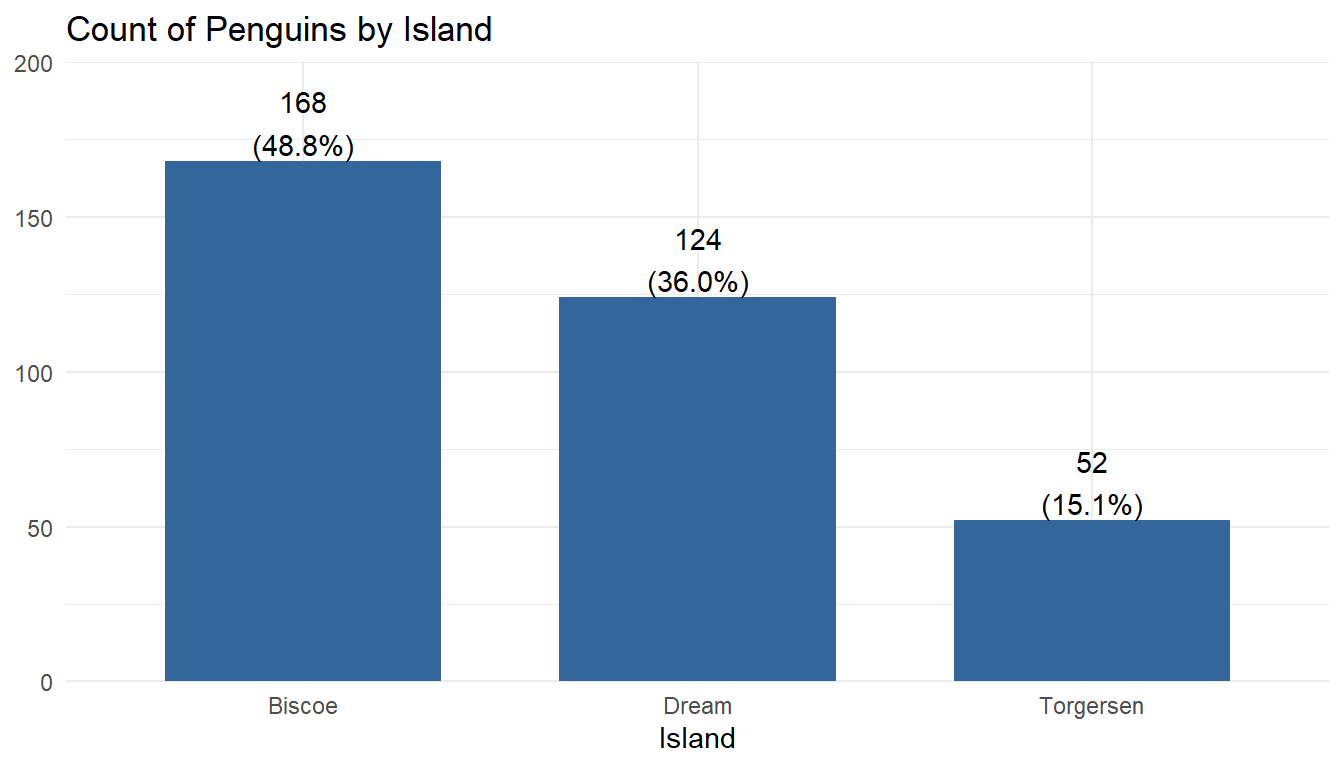 plot_frq(pen$island, title = "Count of Penguins by Island") +