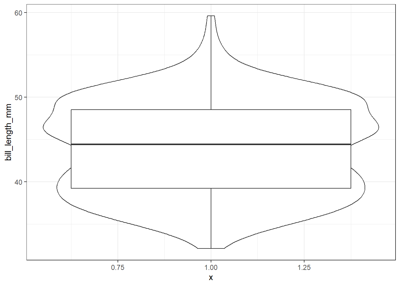 ggplot(pen, aes(x=bill_length_mm)) + geom_histogram(colour="black", fill="white") +