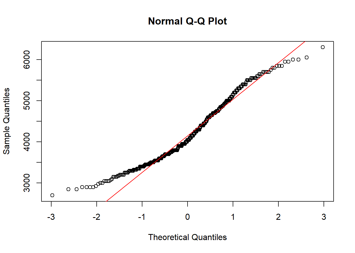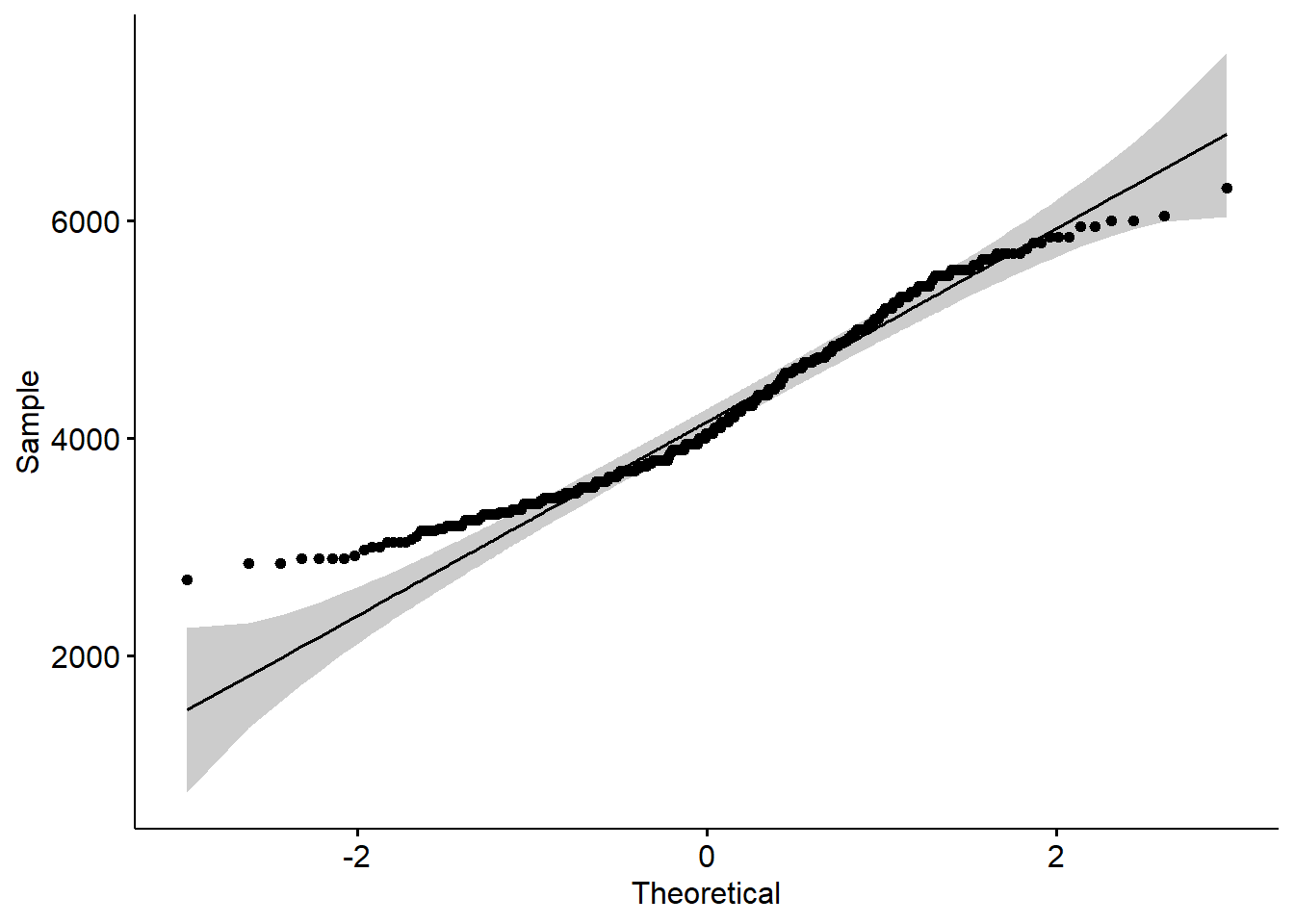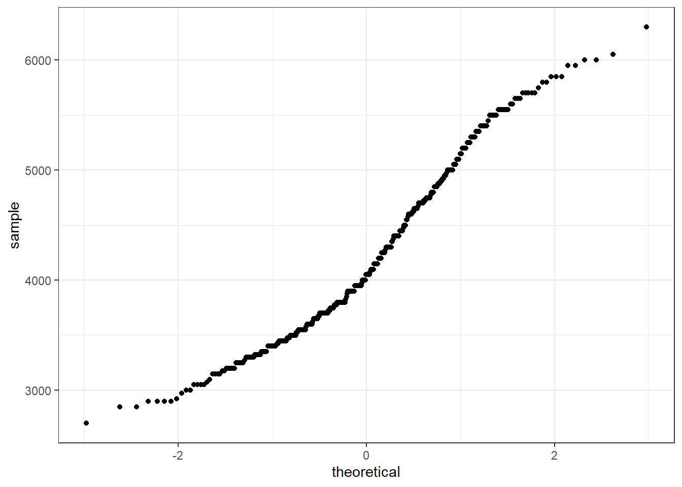 The binwidth here is set by looking at the cut points above that were used to create 7 bins. Notice that darkgrey is the default fill color, but makes it hard to differentiate between the bars. So we’ll make the outline black using colour, and fill the bars with white.