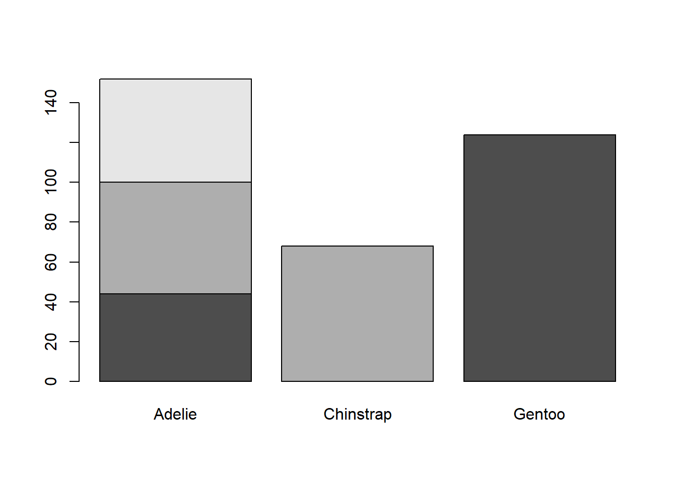 There are 152 Adelie penguins, 68 Chinstrap penguins, and 124 Gentoo penguins in this dataset.