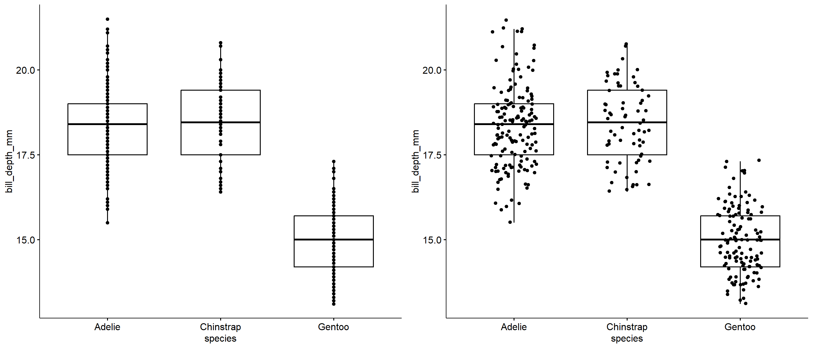 That’s harder to read. So note that just because you can change an aesthetic, doesn’t mean you should. And just because you can plot things on the same axis, doesn’t mean you have to.