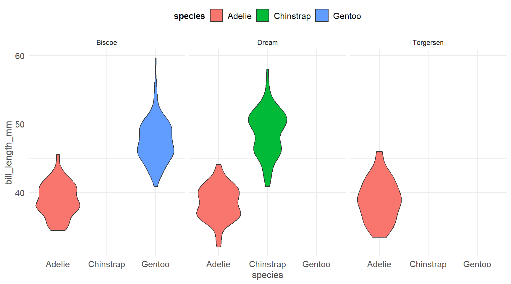 ggplot(pen, aes(x=species, y=bill_length_mm, fill=species)) + geom_violin() + facet_wrap(~island)