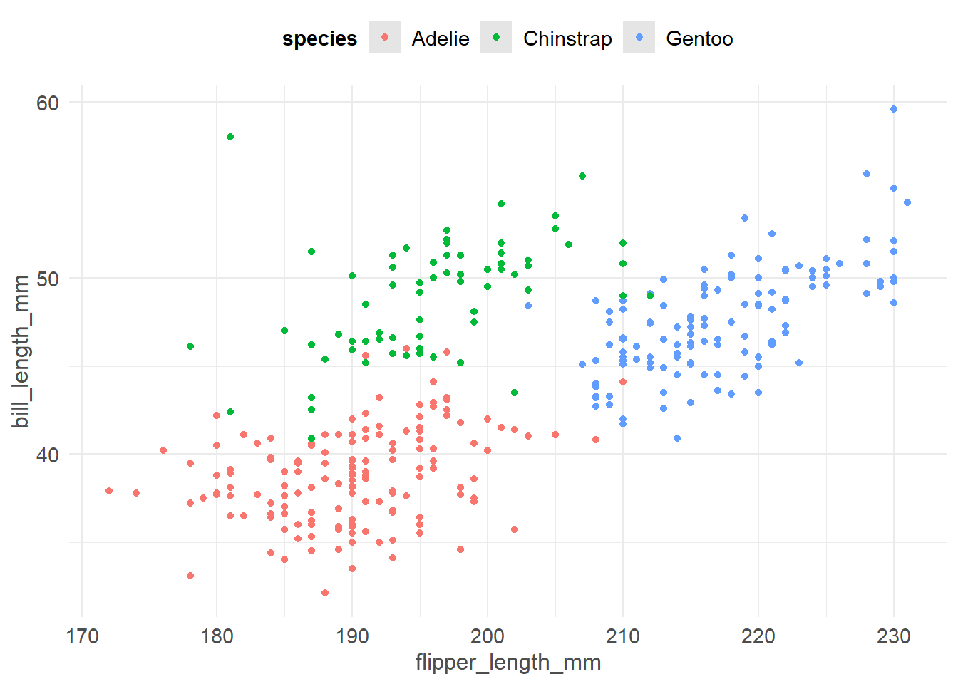 ggplot(pen, aes(x=flipper_length_mm, y=bill_length_mm, color=species)) + geom_point()